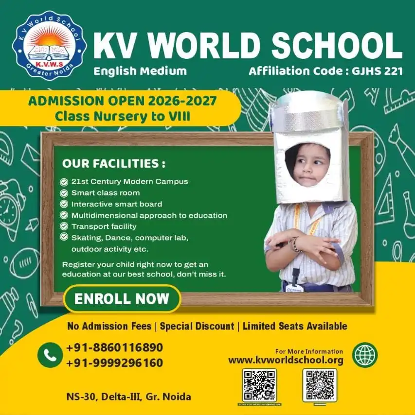 KV WORLD SCHOOL begin in the year 2013, with the vision of providing the finest education to the young learner. KV WORLD SCHOOL work primarily towards building core, academic & personal skills, over the periods of time, KV WORLD SCHOOL is now among top 10 schools in Greater Noida.
